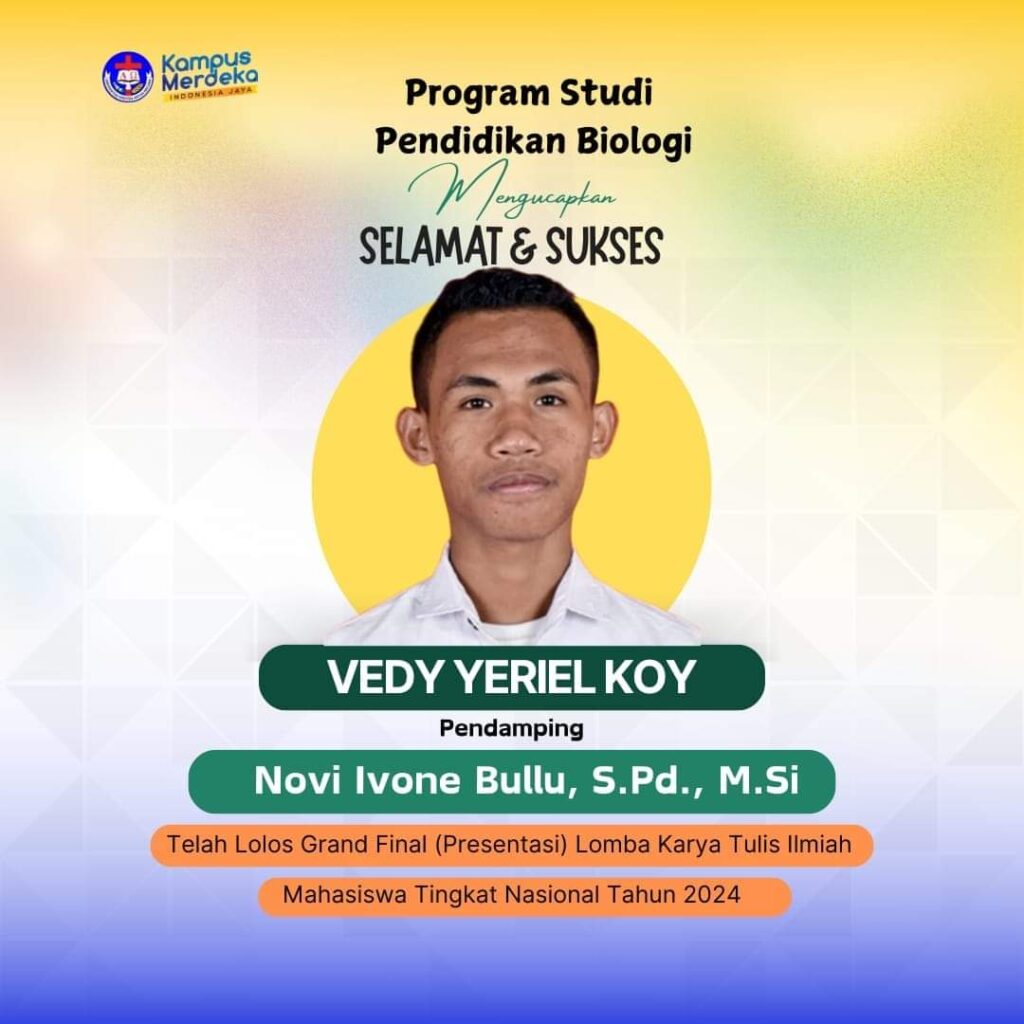 Kupang – Vedy Yeriel Koi, mahasiswa semester 9 dari Program Studi Pendidikan Biologi, Fakultas Keguruan dan Ilmu Pendidikan (FKIP) Universitas Kristen Artha Wacana (UKAW), berhasil lolos dalam Lomba Karya Tulis Ilmiah (LKTI) Mahasiswa Tingkat Nasional 2024 yang diselenggarakan oleh Universitas Timor (UNIMOR). Prestasi ini diraih setelah bersaing dengan 20 peserta lain dari berbagai perguruan tinggi yang mengirimkan artikel ilmiah mereka.